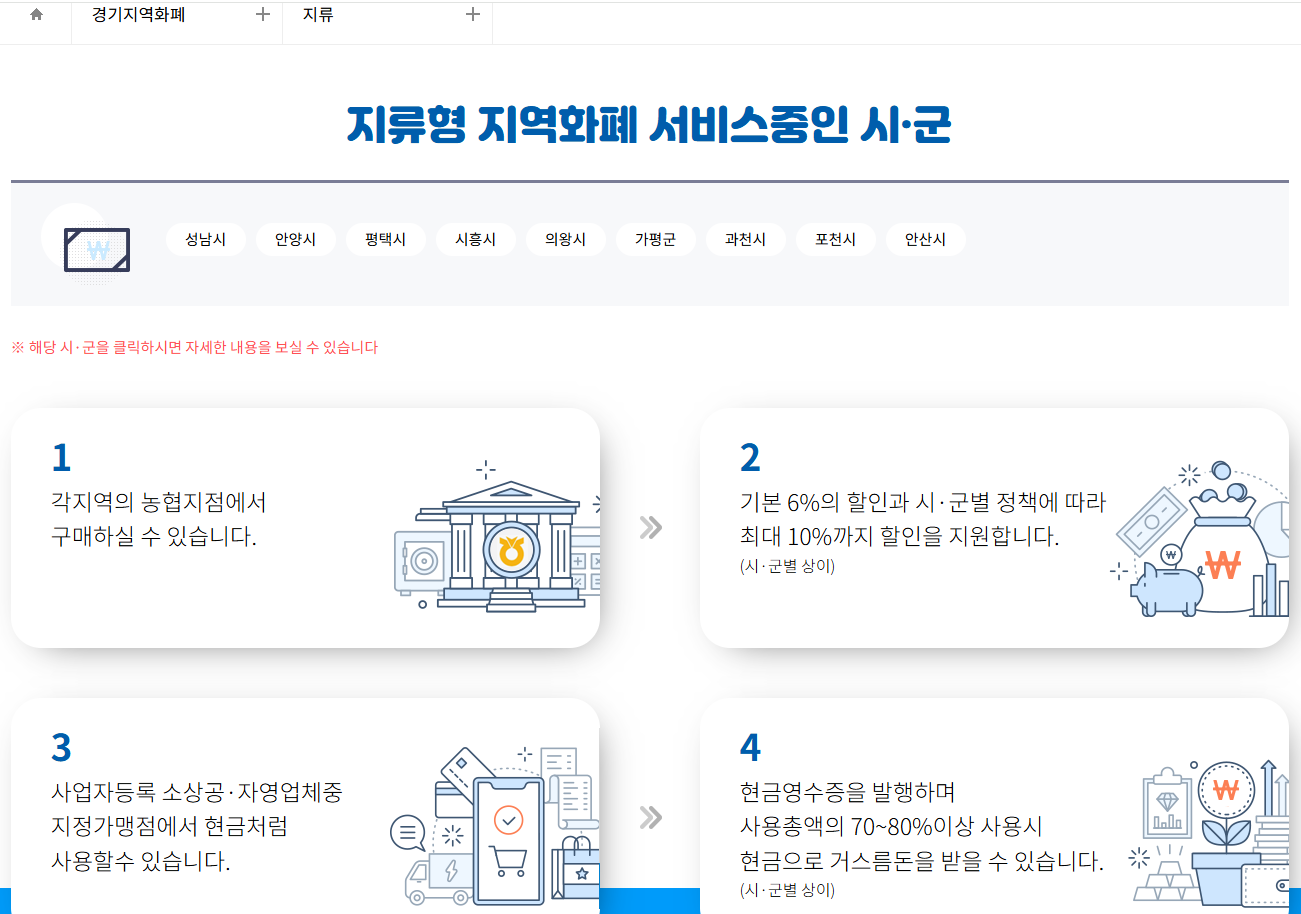 지역화폐는 대형마트, 백화점, 온라인 쇼핑몰, 프랜차이즈 직영점에서는 사용할 수 없습니다.