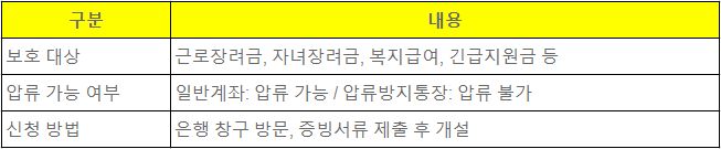 - 일반 통장을 압류방지통장으로 전환 불가, 신규 개설해야 함