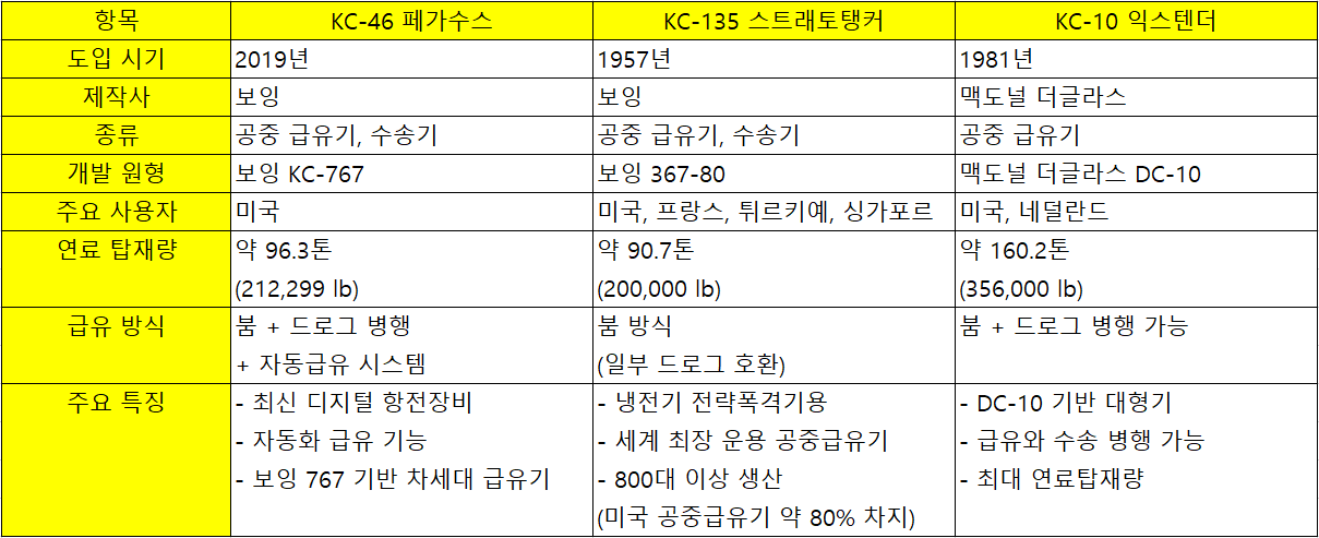 KC-135, KC-10, KC-46 비교표