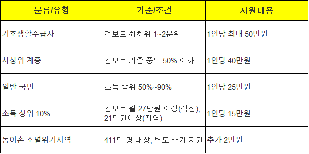 기준은 주로 건강보험료 납부액을 기준으로 삼고 있으며, 소득 상위 10%는 상대적으로 적은 금액을, 기초생활수급자 및 차상위 계층은 더 많은 금액을 지급받게 됩니다.