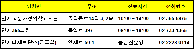 ※ 병원 사정에 따라 운영 여부 및 진료시간 변경 가능하므로 반드시 전화로 확인 후 방문하세요.