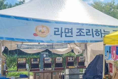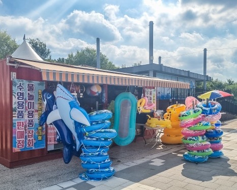 수영장 입구 및 내부에는 간단한 먹거리를 판매하는 부스가 운영됩니다. 대표적으로 한강라면, 아이스크림, 닭강정, 음료 등이 있으며, 간단하게 요기하기에는 충분합니다. 다만 배달 음식은 반입이 불가하므로 주의하세요.