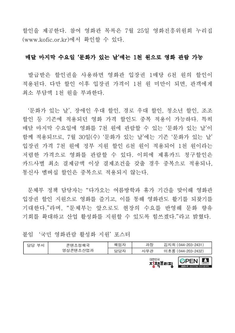 ‘문화가 있는 날’인 7월 30일(수)에는 기존 할인 7천 원 + 정부 할인 6천 원이 더해져 단돈 1천 원에 영화 관람이 가능하다는 사실!