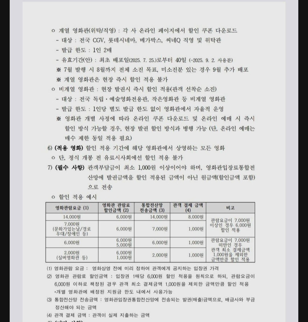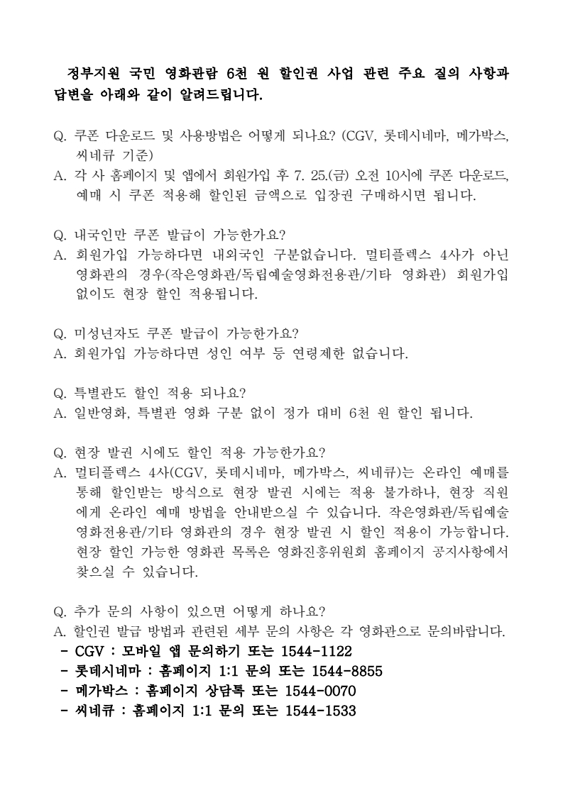 - 멀티플렉스 4사(CGV, 롯데시네마, 메가박스, 씨네큐): 온라인 예매만 가능 (현장 발권 불가)
