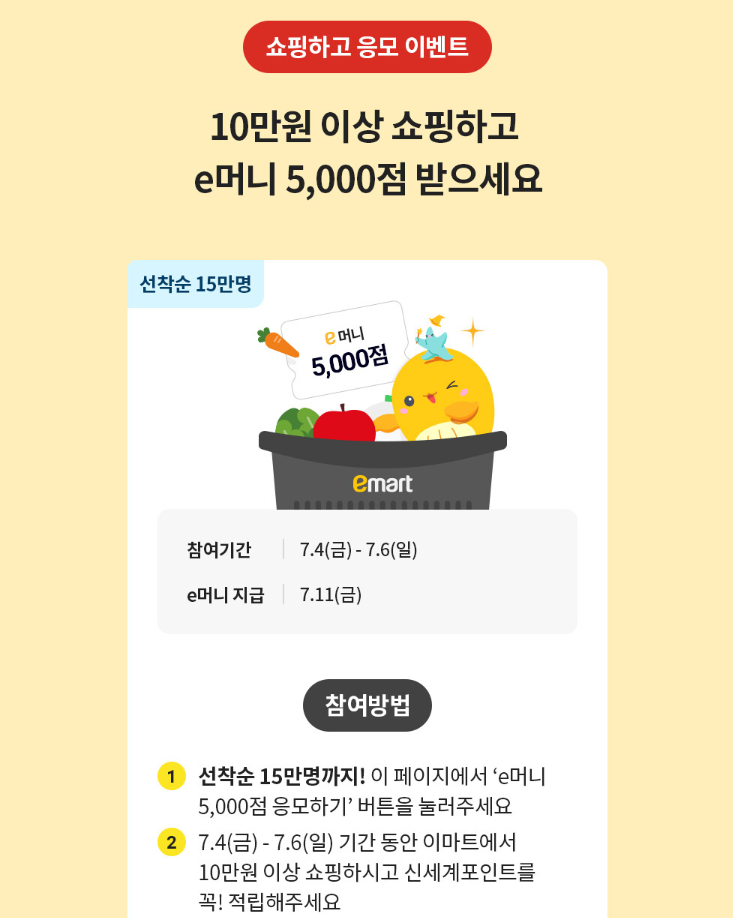 - 10만 원 이상 구매 고객 대상 e머니 5천 포인트 증정 (선착순 15만 명)