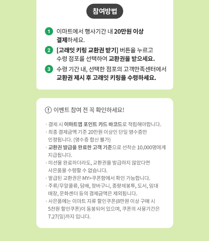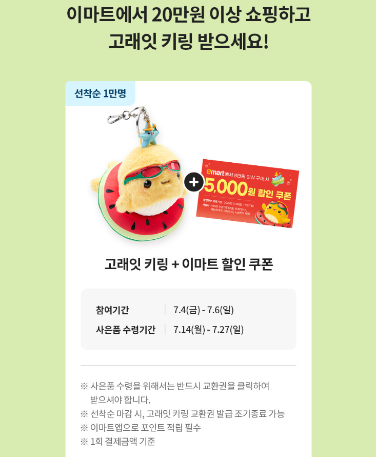 - 사은품 수령일 확인 – 고래잇 키링 등 사은품은 행사 종료 후 지정된 날짜(예: 7/14~27) 내 방문 수령 필요
