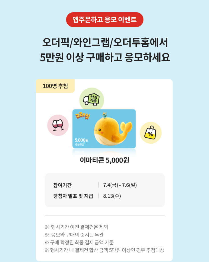 - 5만 원 이상 앱 주문 시 이마티콘 추첨 응모 기회