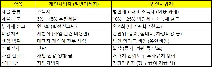 📊 개인사업자 vs 법인사업자 비교표