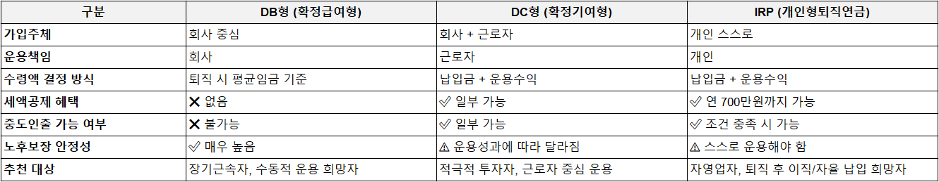 📊 퇴직연금 제도 비교: IRP vs DC vs DB