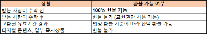 즉, 환불 가능 여부는 상대방이 선물을 수락했는지, 유효기간이 지났는지에 따라 달라집니다.