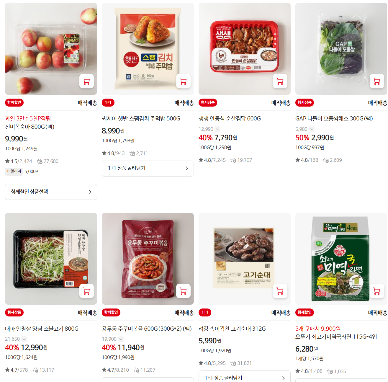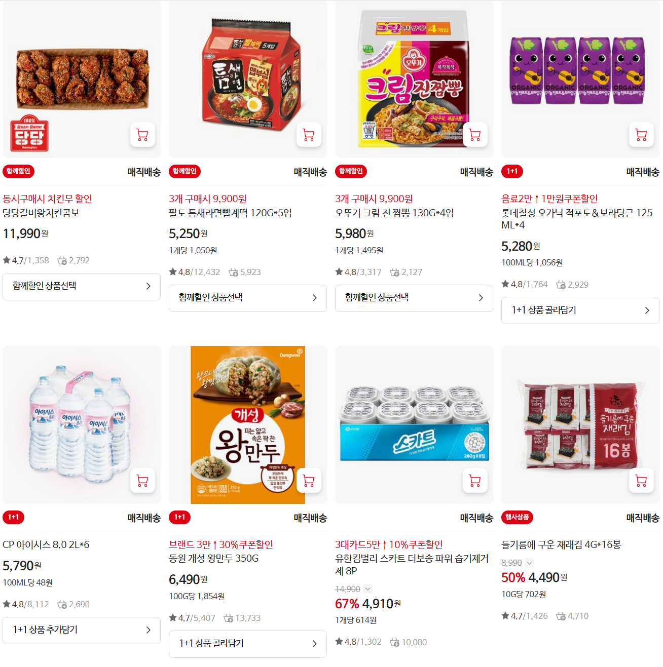 - 컵밥·즉석밥·냉동만두 – 1+1 또는 2+1 구성