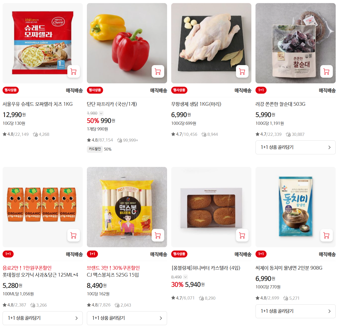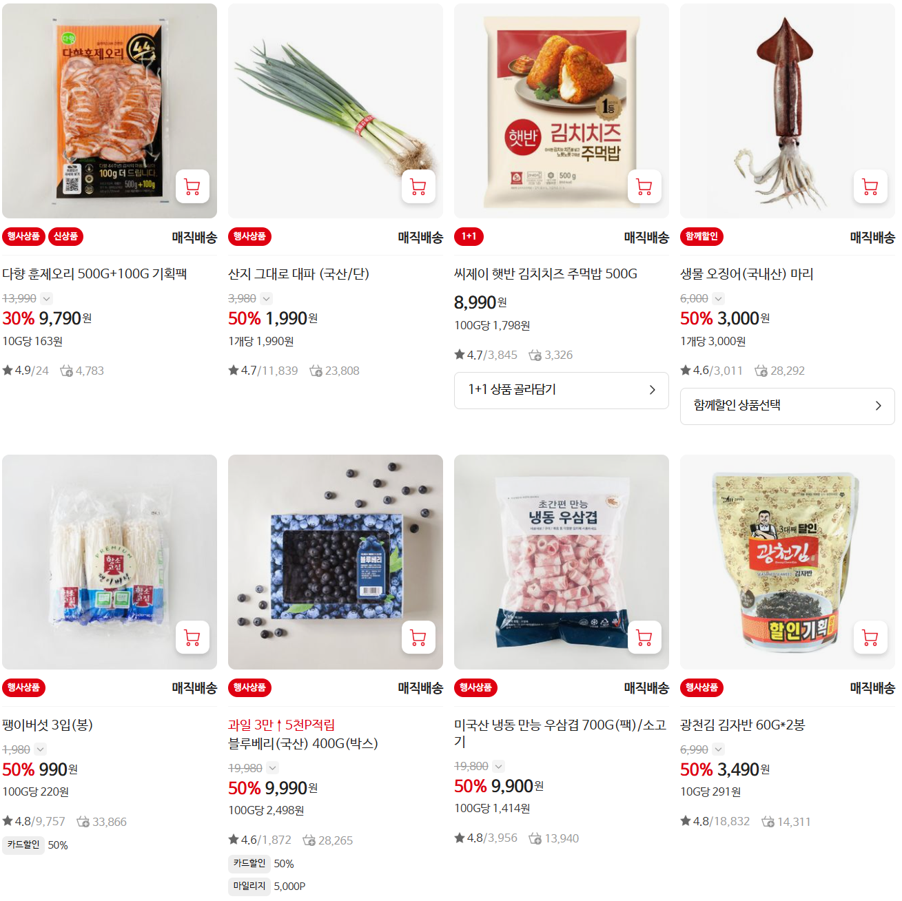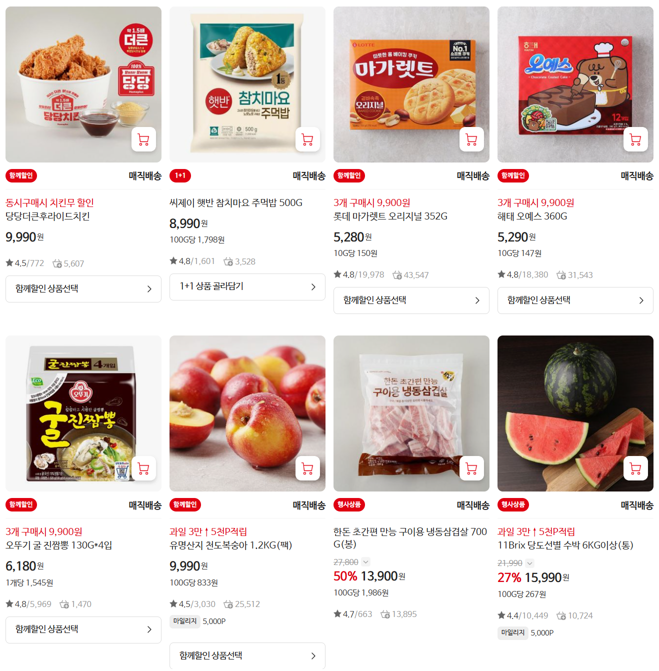 - 할인유형: 전단특가, 멤버특가, 카드사별 할인, 오늘의 쿠폰 5%