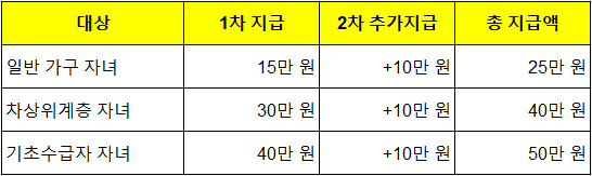기초생활수급자, 차상위계층 아동은 추가 금액도 수령 가능합니다.