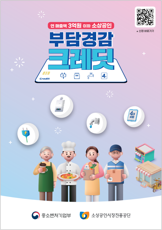 정부가 ‘소상공인 부담경감 크레딧’을 통해 사업 운영에 필요한 비용을 절감할 수 있도록 도와드립니다.