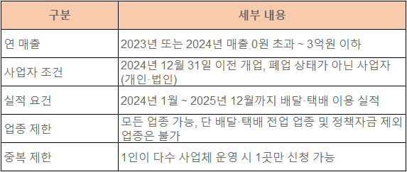 2025년에는 연 매출 3억원 이하 소상공인을 대상으로, 실제 배달·택배 실적을 증빙하면 최대 30만원까지 지원됩니다.