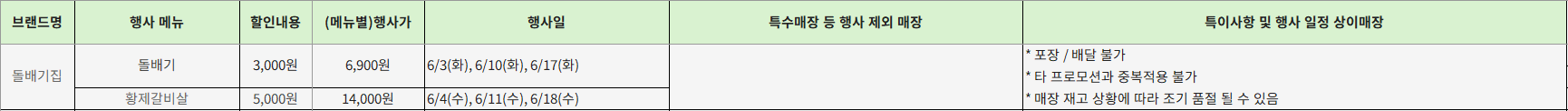 - 행사 기간: 돌배기 > 6/3(화), 6/10(화), 6/17(화) / 황제갈비살 > 6/4 (수), 6/11 (수) , 6/18 (수)