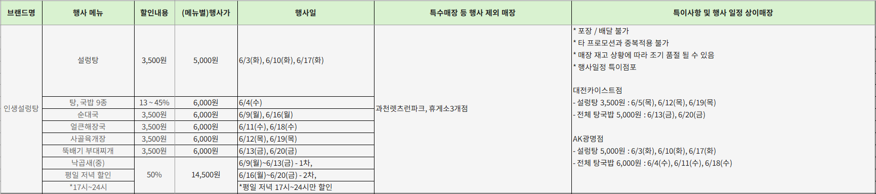 - 특이사항: 포장/배달 불가 (단, 포장전문점은 가능), 지점마다 일정 상이!