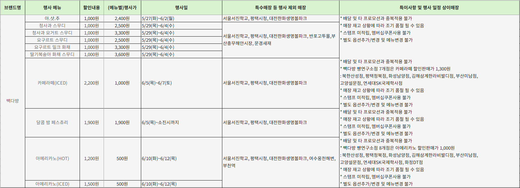 - 특이사항: 일부 매장만 참여, 스탬프/멤버십 미적용, 옵션변경 불가, 배달X 👉 무조건 매장방문 필수!