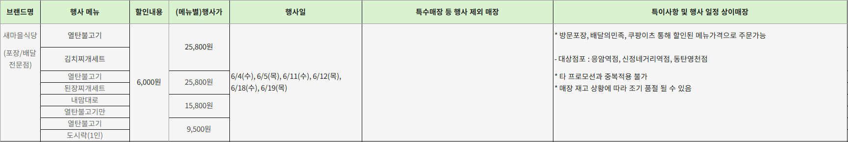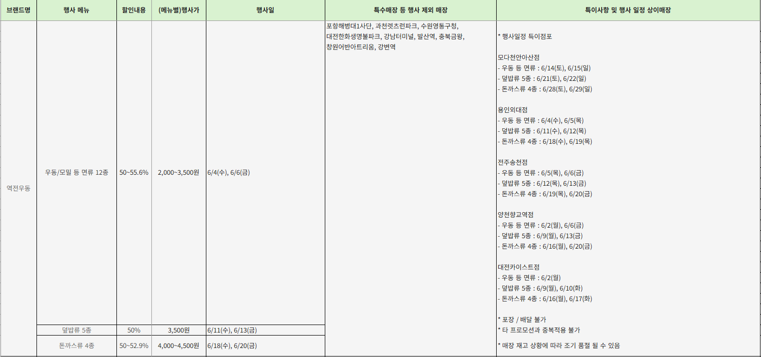 - 행사 기간: 6/2(일) ~ 6/8(토), 6/10(월) ~ 6/11(화), 6/17(월) ~ 6/19(수)