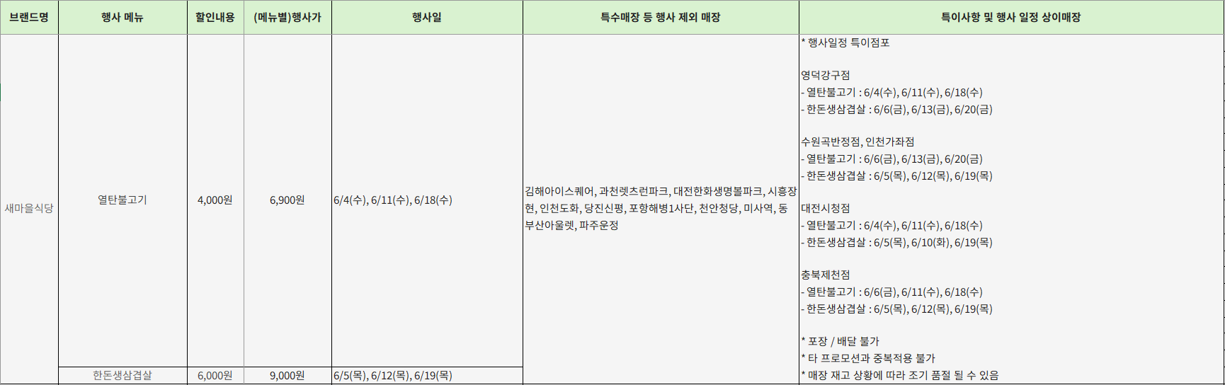 - 할인메뉴: 열탄불고기, 한돈생삼겹살, 반상세트, 도시락