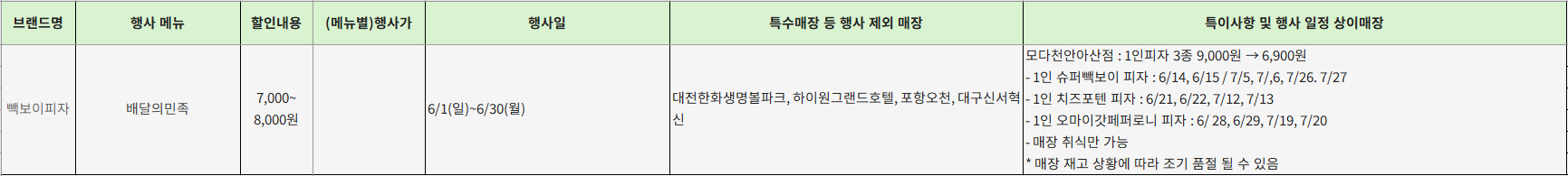 - 추가 혜택: 모다천안아산점은 1인피자 3종 9,000원 → 6,900원 (주말지정일)