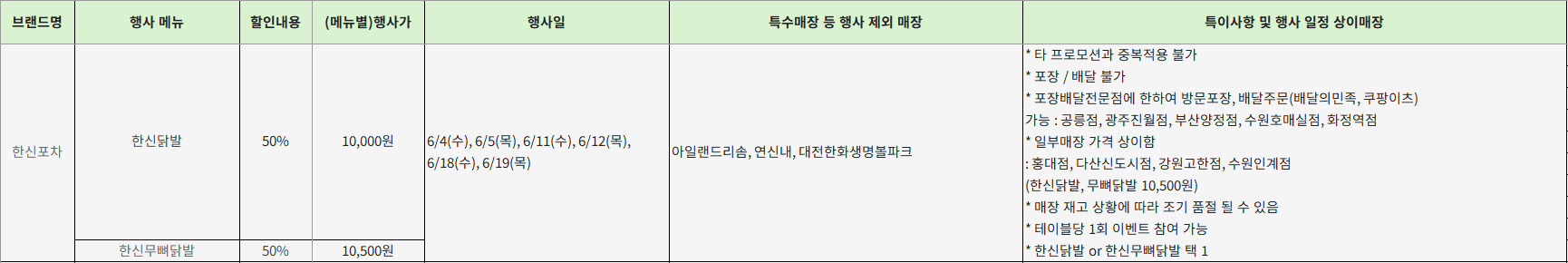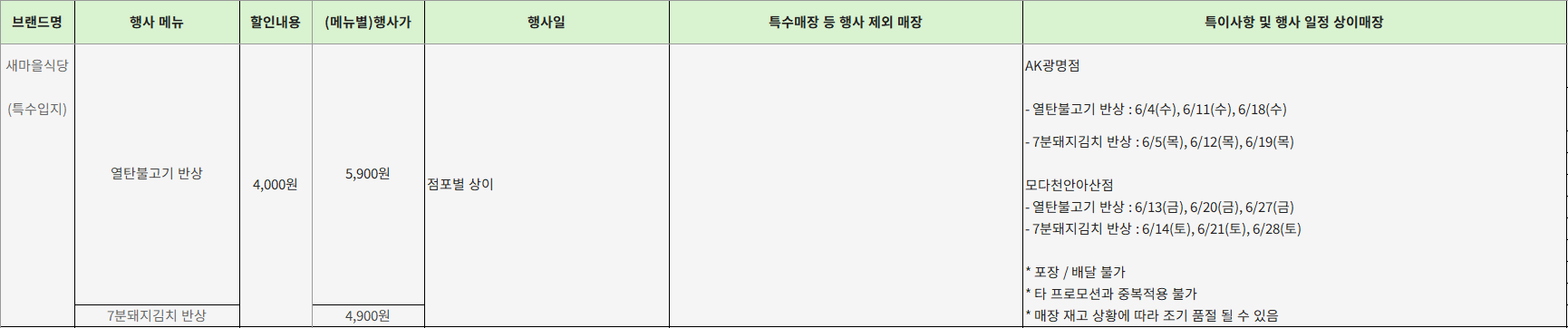 - 특이사항: 배달전문점은 포장 및 배달 할인 가능, 일정지 확인 필수