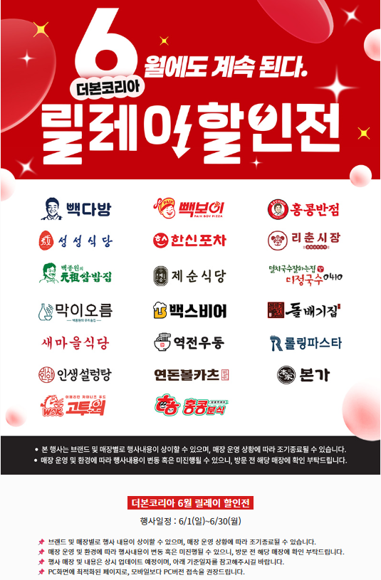 6월은 더본코리아 릴레이 할인전으로 외식도 가볍게! 소개해드린 6개 브랜드도 혜택이 정말 실속 가득하죠? 특히 이번 할인은 요일별, 매장별 상이하기 때문에 꼭! 방문 전 브랜드별 진행 일정과 매장 위치를 확인하시고 방문해 주세요. 한 달 내내 이어지는 더본코리아의 할인 릴레이로 지갑도, 입도 즐거운 6월 되세요!