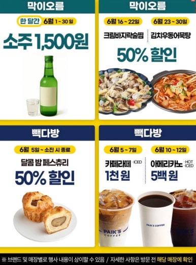 - 행사 기간: 6/5(수), 6/12(수), 6/19(수), 6/26(수) 외