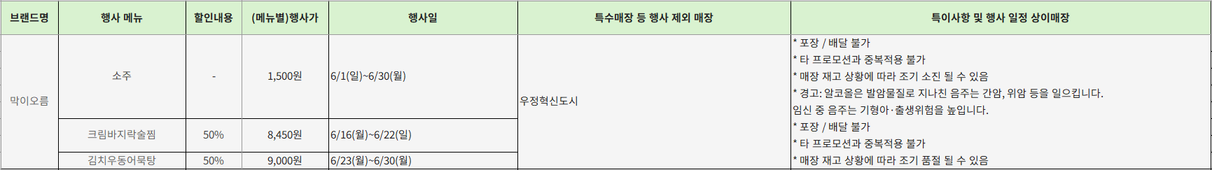 - 특이사항: 테이블당 1회, 포장/배달 불가 (단, 배달전문점은 배달 가능)