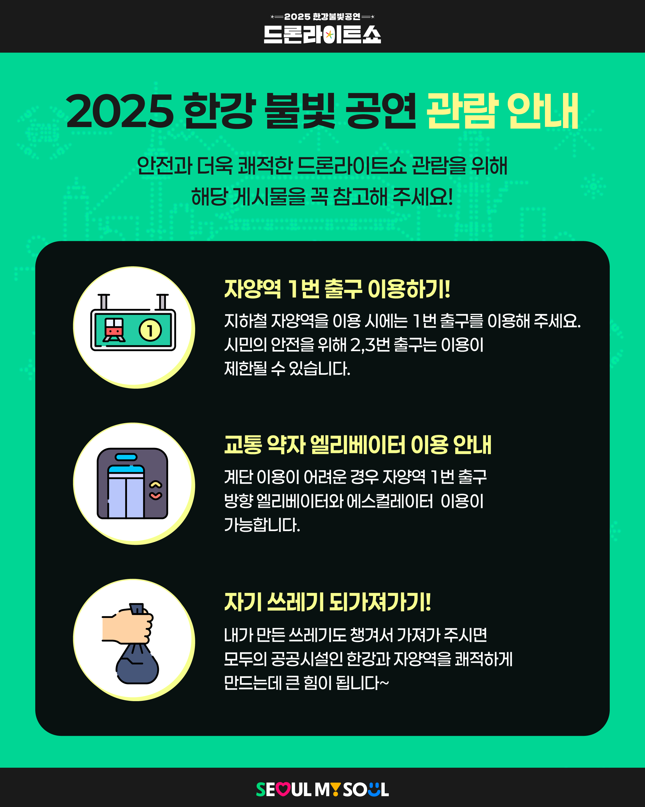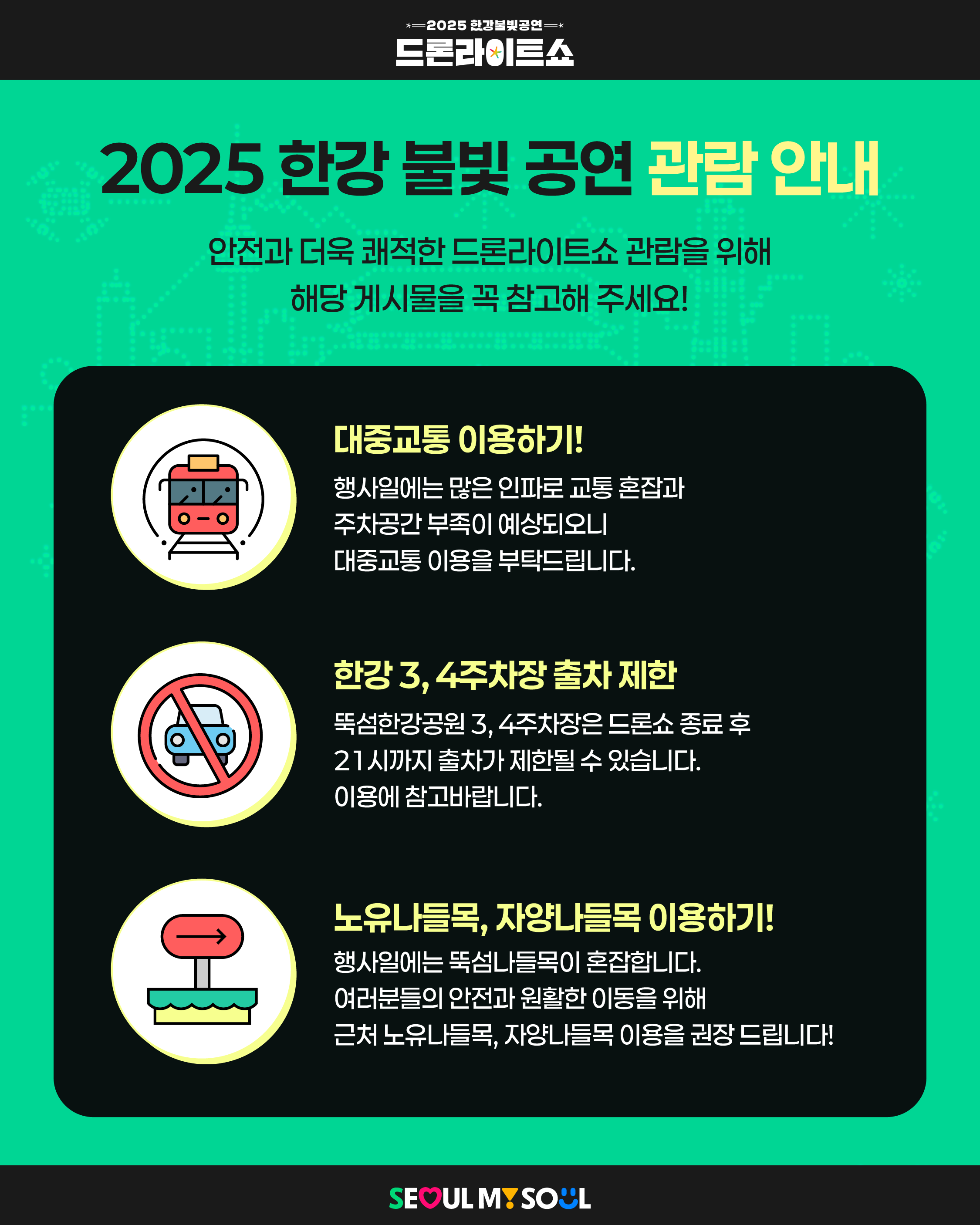 - 🚗 한강 3·4주차장 출차 제한: 드론쇼 종료 후 21시까지 출차가 제한될 수 있습니다.